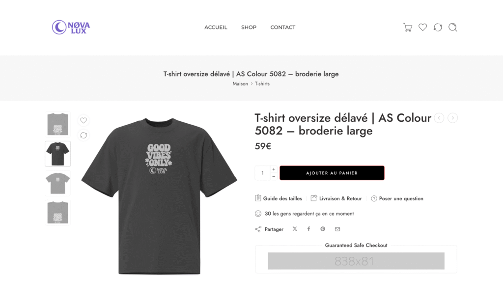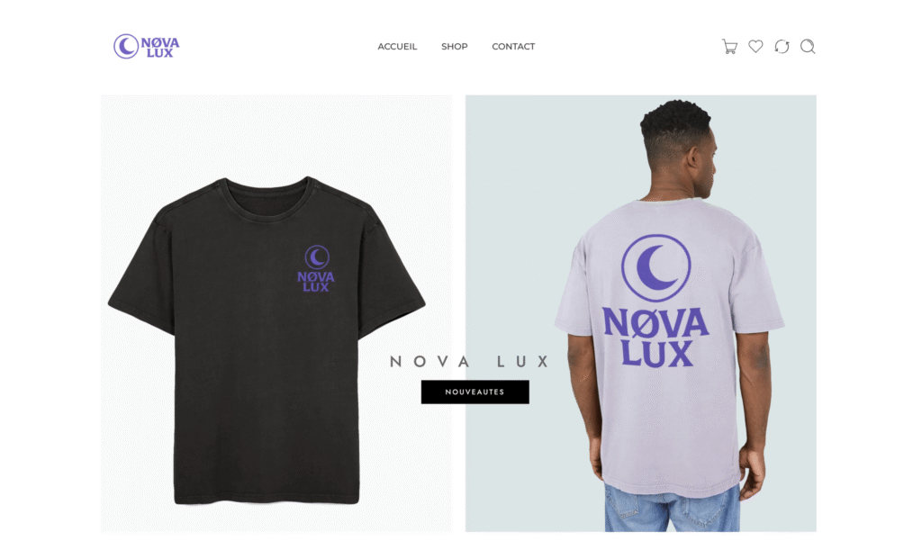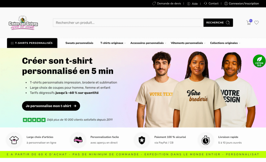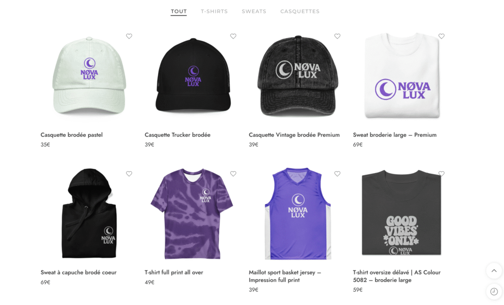 Voici le type de boutique que je te livre en 5 jours. Un e-shop PRO créé pour ta marque textile avec tes designs.